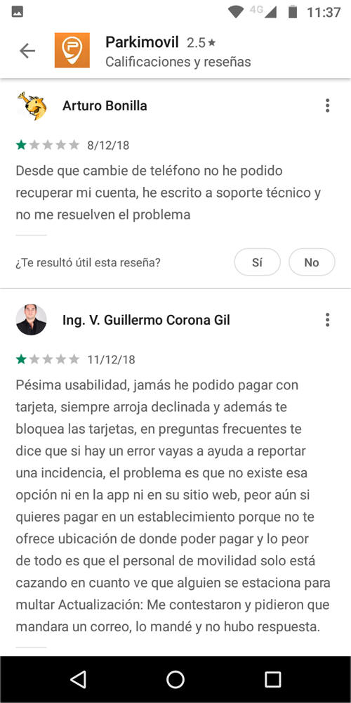 Otro problema denunciado por otro usuario fue que creó su cuenta a través de un teléfono, pero más adelante cambió su celular, y ya no pudo recuperar su cuenta, la aplicación tampoco cuenta con opción de pago para estacionamiento de motocicletas, lo que ha provocado infracciones para los motociclistas, quienes no tienen opciones para poder pagar.