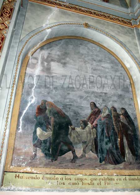 Durante la segunda mitad del siglo XX y principios del XXI no se le brindó el cuidado necesario a estos murales, por lo que se fueron deteriorando por la humedad y filtraciones de agua, además de cuarteaduras que se provocaron en los muros de esta iglesia que se encuentra frente al zócalo de esta localidad que recibió el título de pueblo mágico en noviembre de 2013. Los ocho murales son de una altura aproximada de seis metros de altura y tres de ancho y se pintaron con los temas: “caída en el camino hacia el calvario”, “oración en el huerto”, “la ultima cena”, “la transfiguración”, “el sagrado corazón de Jesús ”, “la resurrección”, “Jesús trasladado al sepulcro” y “la crucifixión”.