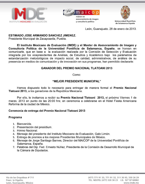 Zacapoaxtla.- El Instituto Mexicano de Evaluación (IMDE) y la Universidad Pontificia de Salamanca España, notificaron vía telefónica y por correo electrónico al edil de este municipio, Armando Sánchez Jiménez, que fue el ganador del premio Tlatoani 2013, como mejor alcalde del año pasado a nivel nacional.