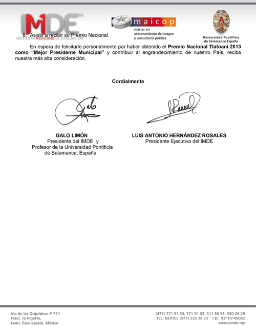 Señaló que la entrega del premio se llevará a cabo el viernes uno de marzo a las 20:00 horas en el hotel Fiesta Americana Reforma de la ciudad de México, evento en el que participarán los directivos del IMDE y de la Universidad española, además del presidente de la comisión de desarrollo municipal de la Cámara de Diputados, Ernesto Núñez Aguilar.