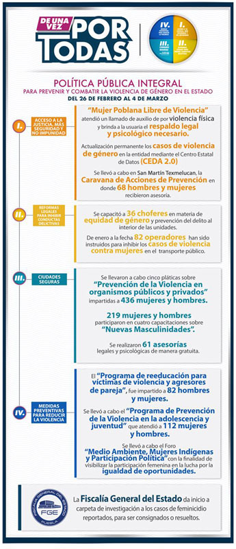 Eje 1 (Acceso a la justicia, más seguridad y no impunidad): Para dar respuesta a los casos de violencia de género y que estos no queden impunes, la Unidad Especial de Atención “Mujer Poblana Libre de Violencia”, de la Secretaría de Seguridad Pública (SSP), atendió en Puebla capital un llamado de auxilio por violencia física. La Fiscalía General del Estado (FGE), a través de la Fiscalía de Atención a Delitos de Género, recibió la denuncia por esta agresión y brinda a la usuaria el respaldo legal y psicológico necesario. Este hecho fue registrado en el Centro Estatal de Datos (CEDA 2.0) como lo indica la cuarta sugerencia de las ocho que realizó la Comisión Nacional para Prevenir y Erradicar la Violencia Contra las Mujeres (Conavim) y se prepara en breve el lanzamiento del portal web de esta base informativa. Para brindar información a la ciudadanía respecto a los servicios que presta la Unidad Especial “Mujer Poblana Libre de Violencia”, personal de este grupo participó en la Caravana de Acciones de Prevención que se llevó a cabo en San Martín Texmelucan, donde 58 mujeres y 10 hombres recibieron la asesoría pertinente. Eje 2 (Reformas legales para inhibir conductas delictivas): En cumplimiento a la Reforma a la Ley del Transporte, la Secretaría de Infraestructura, Movilidad y Transportes (SIMT) capacitó, en materia de equidad de género y prevención del delito al interior de las unidades, a 36 hombres interesados en tramitar por primera vez su licencia de chofer de transporte público y mercantil. De enero a la fecha un total de 82 operadores han sido instruidos en la materia para inhibir los casos de violencia y acoso contra mujeres al interior de las unidades de transporte público. Eje 3 (Ciudades seguras): Por parte del Ayuntamiento de Puebla Capital, a través del Instituto Municipal de las Mujeres (IMM), se llevaron a cabo cinco pláticas sobre “Prevención de la Violencia en organismos públicos y privados”, impartidas a 305 mujeres y 131 hombres. Adicional a ello, 89 mujeres y 130 hombres participaron en cuatro capacitaciones sobre “Nuevas Masculinidades”. Durante la semana el IMM realizó 61 asesorías legales y psicológicas de manera gratuita. Eje 4 (Medidas preventivas para reducir la violencia): Para reforzar la cultura de la prevención y la denuncia, la Secretaría de Salud del Estado de Puebla (SSEP) realiza permanentemente el “Programa de reeducación para víctimas de violencia y agresores de pareja”, que en esta semana fue impartido a 49 mujeres y 32 hombres. En complemento a este ejercicio de concientización, se llevó a cabo el “Programa de Prevención de la Violencia en la adolescencia y juventud” atendió a 84 mujeres y 28 hombres. Estos talleres coadyuvan en el cumplimiento de la quinta sugerencia de Conavim. Finalmente, con el objetivo de abordar temas sobre perspectiva de género, el Instituto Poblano de las Mujeres llevó a cabo el Foro “Medio Ambiente, Mujeres Indígenas y Participación Política”. Este encuentro tuvo como finalidad visibilizar la participación femenina en la lucha por la igualdad de oportunidades bajo el respeto de sus derechos humanos.