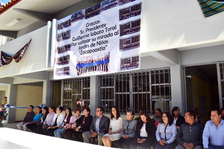 Lobato Toral informó que en tres años ocho meses que lleva la administración, se han construido 144 aulas y 34 desayunadores en escuelas del municipio y ofreció que para el ejercicio 2018, en este mismo preescolar “Zacapoaxtla”, construirá un desayunador para que mejore la atención de los alumnos. Además del desayunador dijo que continuarán los apoyos a este Jardín de Niños como la aplicación de impermeabilizante en las aulas de mayor antigüedad, se pintará la estructura del techado y se apoyará en lo que requiera este que es el preescolar más grande respecto al número de alumnos del municipio. Los estudiantes del tercer grado ofrecieron a las autoridades la presentación de la Fantasía Serrana, además de que alumnos y el comité de padres de familia dieron las gracias al Ayuntamiento por los apoyos que recibieron en este 2017.