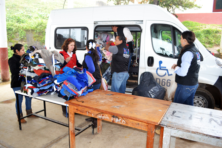Margarita Lobato Toral, Presidenta del DIF, presidió la entrega de pantalones, chamarras, suéteres a alumnos del preescolar “Xicoténcatl” y la primaria “Nicolás Bravo” de esta localidad, considerada la comunidad con mayores índices de pobreza y marginación del municipio.