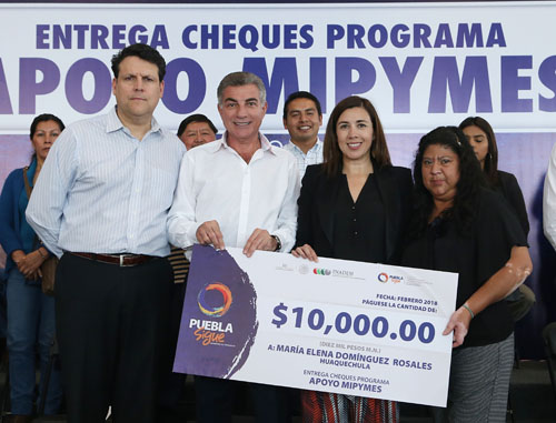 Informó que las MiPyMEs generan el 73% del empleo en México, por lo que resaltó la importancia de contar con políticas de estado que beneficien a los emprendedores y, con ello, más personas puedan ser dueñas de su propia economía. El Secretario de Competitividad, Trabajo y Desarrollo Económico, Jaime Oropeza, detalló que con una inversión de 5 millones de pesos, el gobierno del estado, en coordinación con el INADEM y la Delegación de la Secretaría de Economía en Puebla, colaboran para atender hasta 500 negocios siniestrados con cheques de 10 mil pesos por empresa. Estuvieron presentes el Coordinador para la Reconstrucción, Eugenio Mora; el delegado federal de la Secretaría de Economía, Juan Pablo Jiménez; el delegado federal de Nacional Financiera, José Luis Flores; el Presidente del Consejo Coordinador Empresarial, Carlos Montiel; el director general de Programas de Sectores Estratégicos y Desarrollo Regional del INADEM, Rolando Zubirán y la Coordinadora de Proyecto de Apoyo a la Recuperación Post Sismo y representante del Programa de las Naciones Unidas para el Desarrollo, Mónica Martínez; autoridades de los tres órdenes de gobierno, presidentes municipales y beneficiarios.