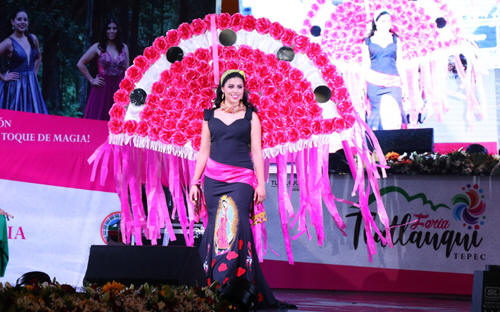 Lilián portó un traje estilizado de la danza de Los Negritos, relató el origen de esta danza que se preserva en la zona baja del municipio y habló acerca de las bellezas naturales como cascadas y la Presa de la Soledad y María Fernanda portó un traje estilizado de la danza de Los Quetzales, representando a la zona centro de este municipio.