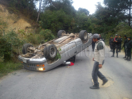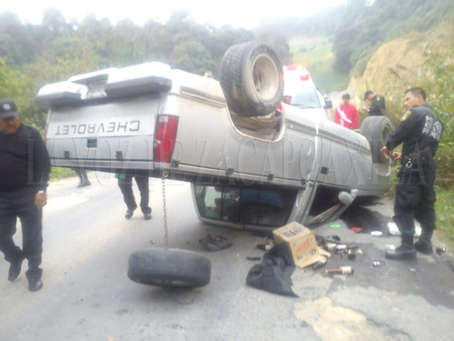 El subdelegado de seguridad vial, Armando Ortiz Juárez informó que la tarde del sábado siete de abril en el kilometro 3+100 del tramo Zacapoaxtla – Cuetzalan, en el paraje de San Carlos, el conductor de una camioneta pick up, placas SG12374  del estado de Puebla, modelo 1993, perdió el control y se volcó sobre la cinta asfáltica, pero se desconoce a quien pertenece la unidad, puesto que se llevaron la tarjeta de circulación.