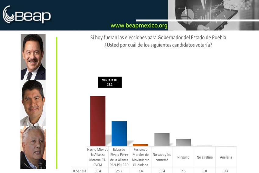 Puebla.- El coordinador de la bancada de Morena en San Lázaro, Ignacio Mier Velazco, ganaría la gubernatura de Puebla en 2024 con amplia ventaja si fuera el candidato de la alianza Morena-PT-Verde por una diferencia de 25.2 por ciento, frente a su posible contrincante de la oposición del PRI, PAN y PRD el alcalde, Eduardo Rivera Pérez, así lo informó el director del BEAP, Juan Rodolfo Rivera Pacheco.