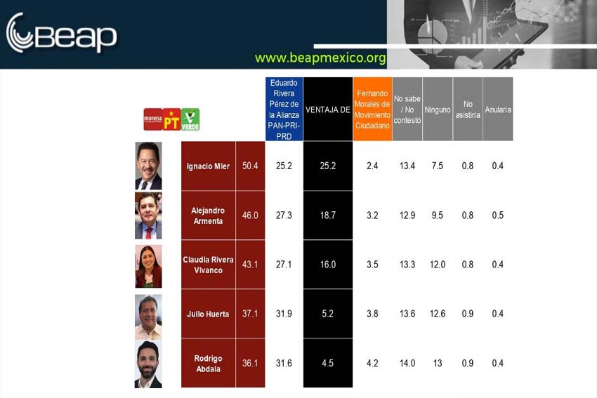 De las encuestas, la que destaca es un muestreo cara a cara en donde ubican a cada precandidato de Morena frente a Eduardo Rivera de la oposición PAN-PRI-PRD y Fernando Morales de Movimiento Ciudadano. Sin embargo, cada morenista gana las elecciones a gobernador, pero con diferentes porcentajes.