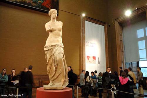 ·         Afrodita o también conocida como La venus de Milo. Célebre escultura griega descubierta en 1820 en la isla de Milo, en el mar Egeo. Su creación data del fin de la época Helénica (hacia los años 130 a 100 a.C). La estatua representa a una mujer más grande de lo normal, 2.04 mts y está constituida por dos bloques de mármol de Paros. Ambos brazos de la estatua nunca fueron encontrados. Fue comprada al inicio por el marqués de la Riviera a un alto dignatario Turco, tiempo después el marqués la ofrecería al rey Louis XVIII el 21 de Marzo de 1821, desde entonces está en el museo de Louvre. Actualmente se encuentra ubicada en la sala 5 del sótano del pabellón Denon, de antigüedades griegas, etruscas y romanas.